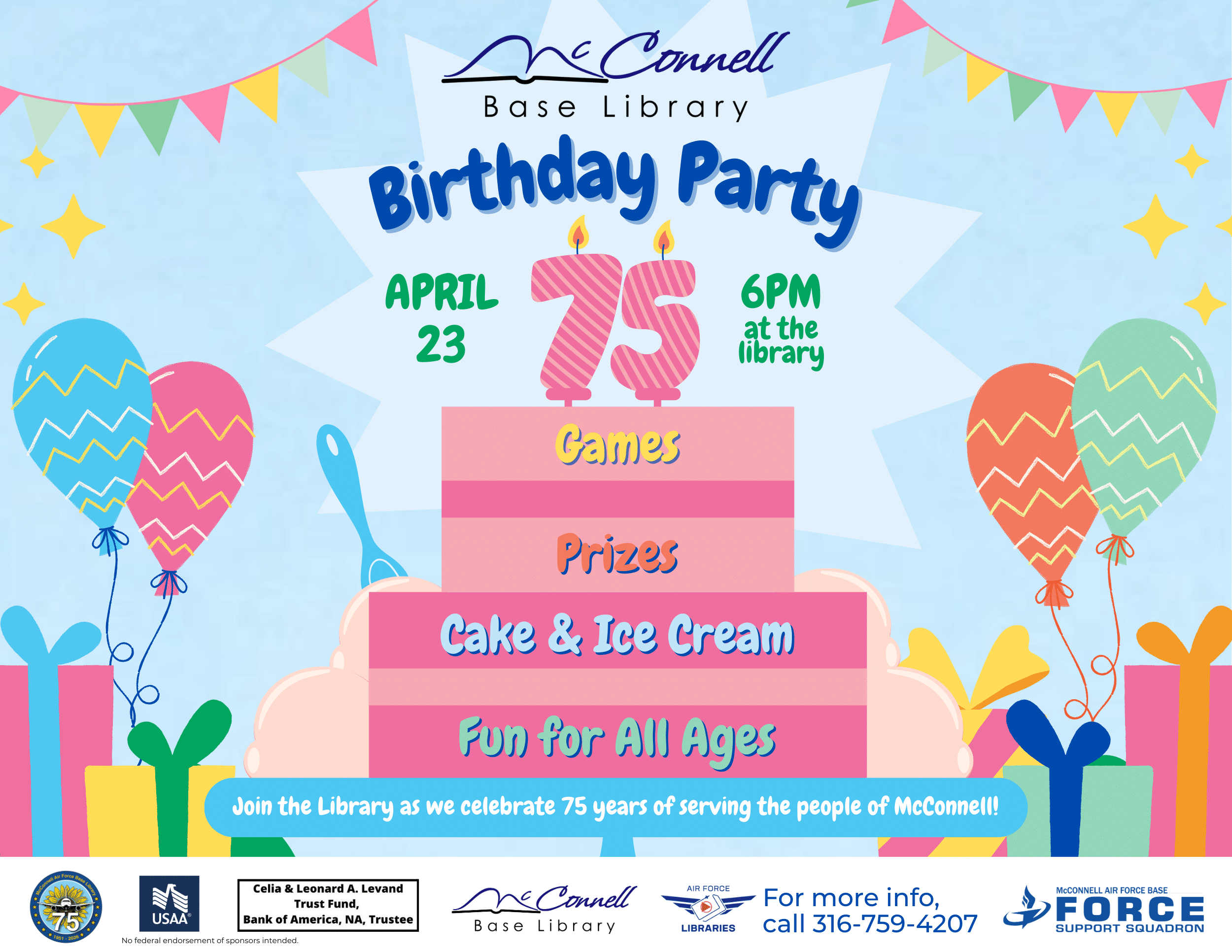 Join the Library to Celebrate our 75th Year serving the people of McConnell!! We will have Cake and Ice Cream, games and prizes to win! This is an event for all ages!